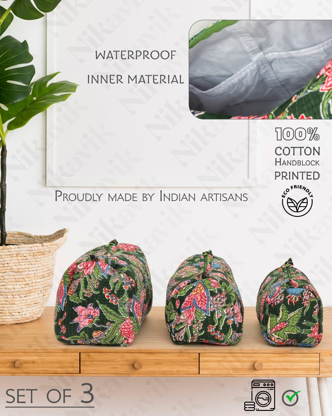 Green Handcrafted Quilted Cotton Pouch Set – Pack of 3